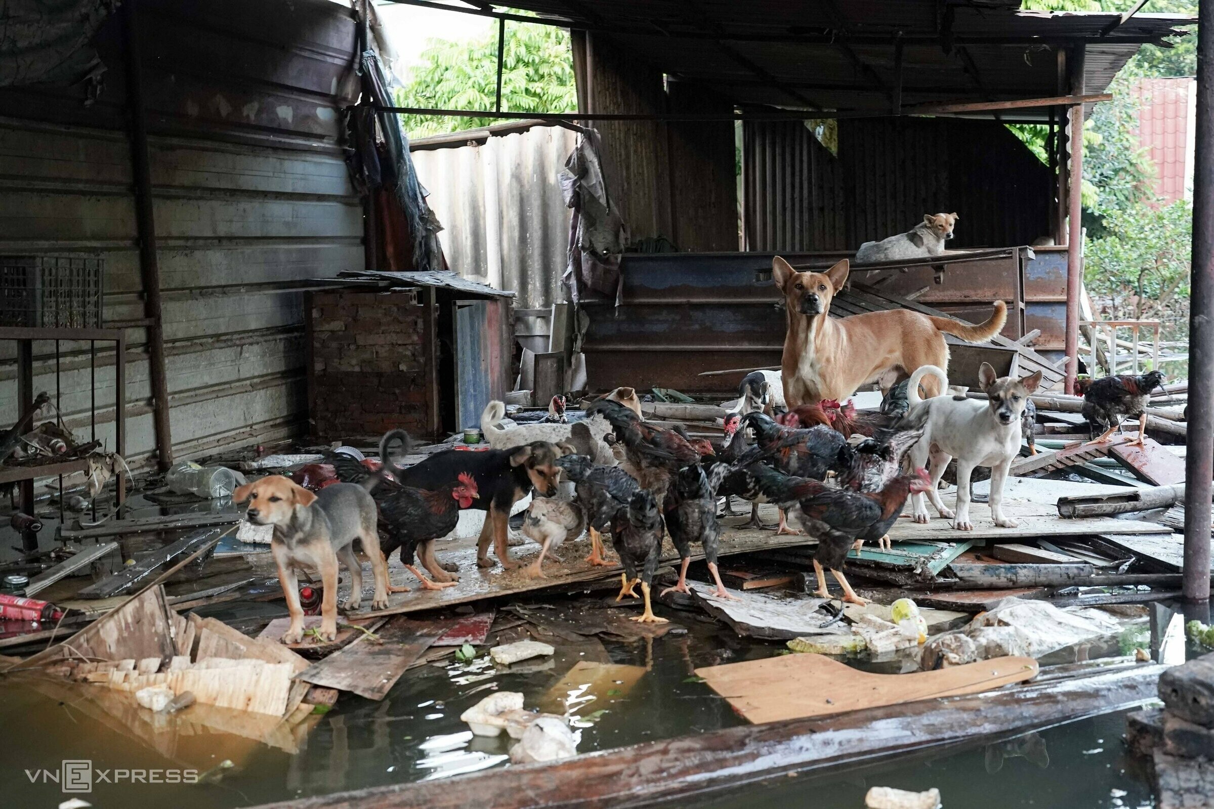 Cạnh nhà ông Bình, bà Niên kê những tấm gỗ lớn làm chỗ cao để trú cho đàn gà và mấy con chó. “Năm nay nước lên nhanh quá, dù đã kịp di chuyển vật nuôi lên cao nhưng vẫn chết mất một con lợn”, bà nói.