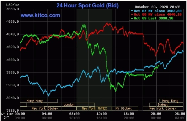 Thị trường đi xuống do đôla Mỹ tăng giá và nhà đầu tư bán chốt lời sau khi giá vượt mốc 4.000 USD phiên trước đó. Ngày 8/10, kim loại quý có thời điểm lập kỷ lục mới tại 4.059 USD một ounce. Thông tin về thỏa thuận ngừng bắn giữa Israel và Hamas cũng khiến nhu cầu trú ẩn sụt giảm.