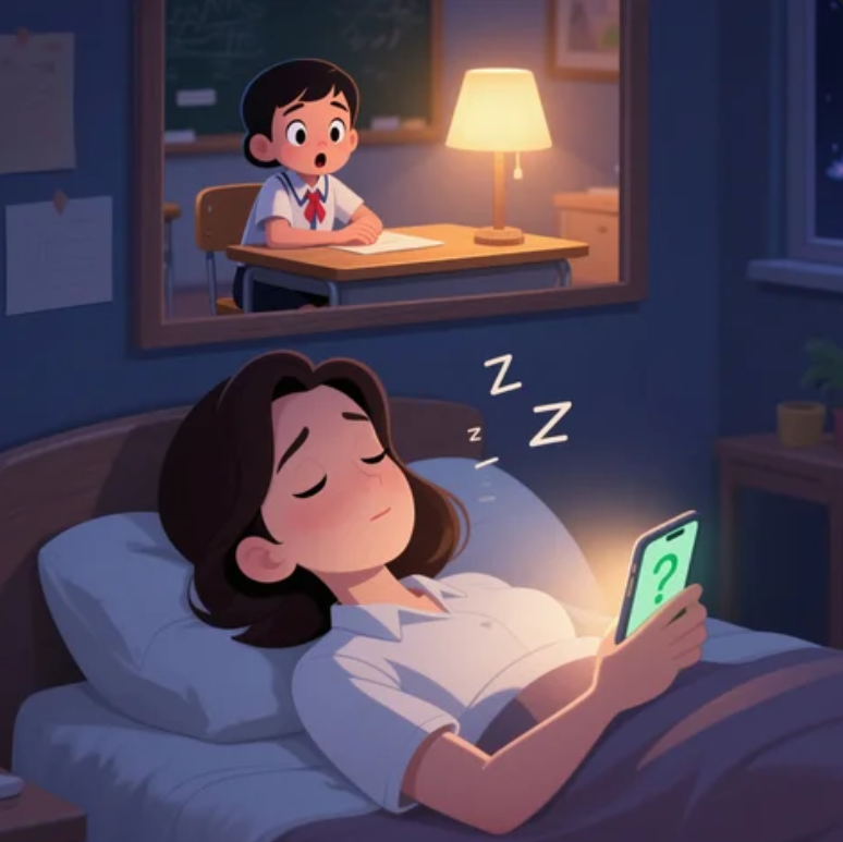 – Cô thì ngủ ngon rồi… còn em vẫn đang làm bài tập đây!