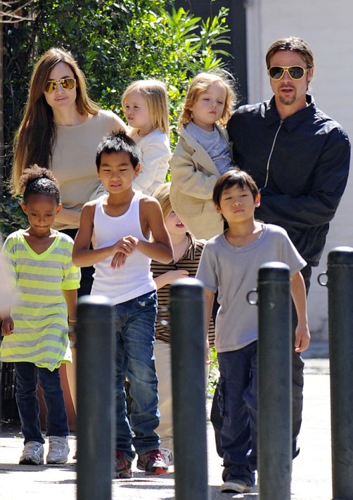 Brad và Angelina chia nhau chăm sóc con. Brad th́ chăm “ba gă đàn ông đáng gờm” (vài lần người ta thấy Brad và 2 ông con trai lớn rủ nhau đi chơi riêng: xem phim, ăn uống, chơi game và hét ḥ ầm ĩ) c̣n Angelina chăm sóc 3 cô công chúa nhỏ quậy như quỷ sứ.