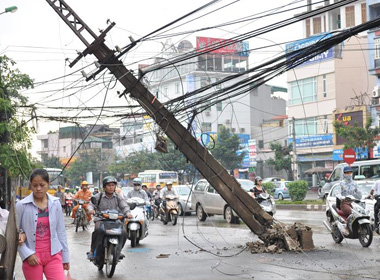 Cột điện bật gốc đổ nghiêng giữa phố Hà Nội