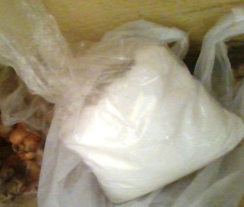Sau khi tẩy rửa xong đống thịt ôi, tôi bê vào nhà để cho một người khác thái ra rồi xiên vào nướng. Vừa mới bê vào bếp đã thấy ở dưới đất có một túi nilong màu trắng như túi muối.