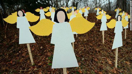 | Hình thiên thần bằng gỗ tượng trưng cho 27 nạn nhân trong vụ xả súng được đặt trên một ngọn đồi ở Newtown. |
