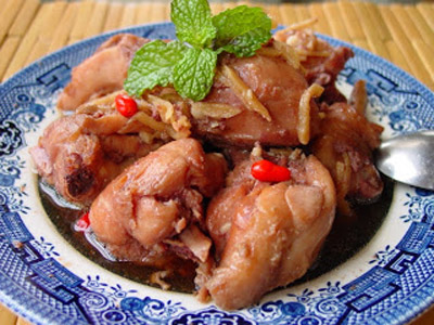 -Cho thịt gà vào một thố lớn. Ướp vào thịt gà gừng + tỏi + 4 muỗng canh nước mắm + 3 muỗng canh đường + 3 muỗng cà phê bột súp gà + 1/2 muỗng cà phê tiêu + 2 muỗng canh dầu hào + 2 muỗng canh nước màu hoặc 1 muỗng canh nước tương đen. Đậy kín, để trong tủ lạnh một ngày cho thịt thấm đều gia vị.