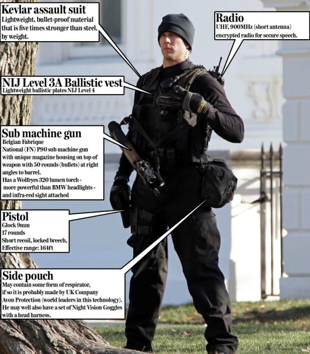 Các thành viên đội phản ứng khẩn cấp Sở Mật vụ chịu trách nhiệm bảo vệ ông Obama trong Nhà Trắng. Mỗi thành viên này đều được trang bị vũ khí đến tận răng, có kỹ năng võ thuật và bắn súng hết sức cao cường. Khi làm việc họ mặc áo giáp chống đạn Kevlar cứng hơn thép 5 lần, sử dụng súng máy FN P90 và súng lục Glock cùng nhiều thiết bị khác.