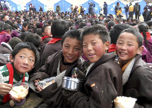Học sinh một trường tiểu học địa phương ăn trưa tại lều tạm sau khi trận động đất 6,3 độ Richter tấn công huyện Khang Định, châu tự trị Ganzi Tibetan ở tỉnh Tứ Xuyên, tây nam Trung Quốc. (Ảnh: Reuters)