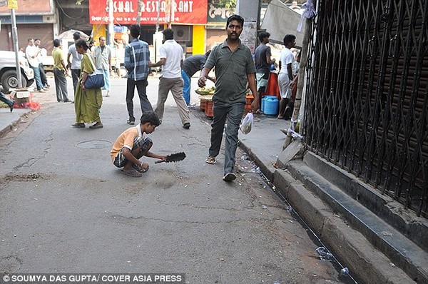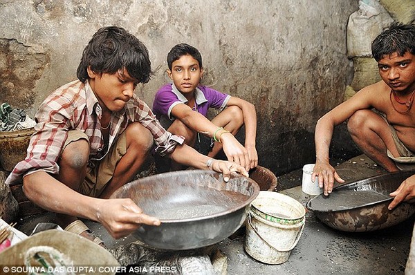 Trẻ em chà bụi bẩn trên đường phố để thu thập bụi vàng từ 2000 xưởng đồ trang sức ở Kolkata, miền đông Ấn Độ sau đó bán lại cho các tiệm kim hoàn