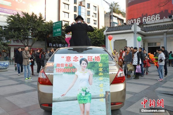 Trưa ngày 21/12, tại một quảng trường quận Tân Đô, thành phố Thành Đô, tỉnh Tứ Xuyên (Trung Quốc), một nam thanh niên ăn mặc bảnh bao, ngồi trên nóc một chiếc ô tô hạng sang với tấm biển “ tìm người bạn trăm năm qua ý niệm”.