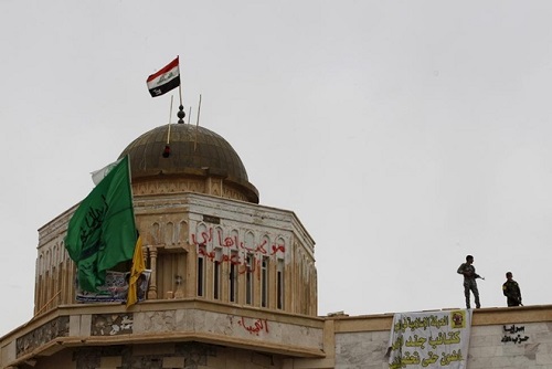 Trong ảnh, hai binh sĩ Iraq đứng gác trên cổng vào thành phố.