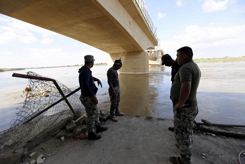 Trong ảnh, các tay súng thuộc lực lượng an ninh Iraq đứng bên dòng sông Tikrit, nơi vào tháng 6 năm ngoái IS được cho là đã hành hình hơn 1.000 học viên không quân người Shiite mà chúng bắt giữ từ trại Speicher.