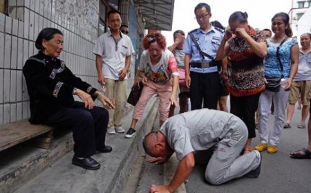 Ông Yang cúi lạy mẹ sau khi được trả tự do. Ảnh:Thepaper.cn .