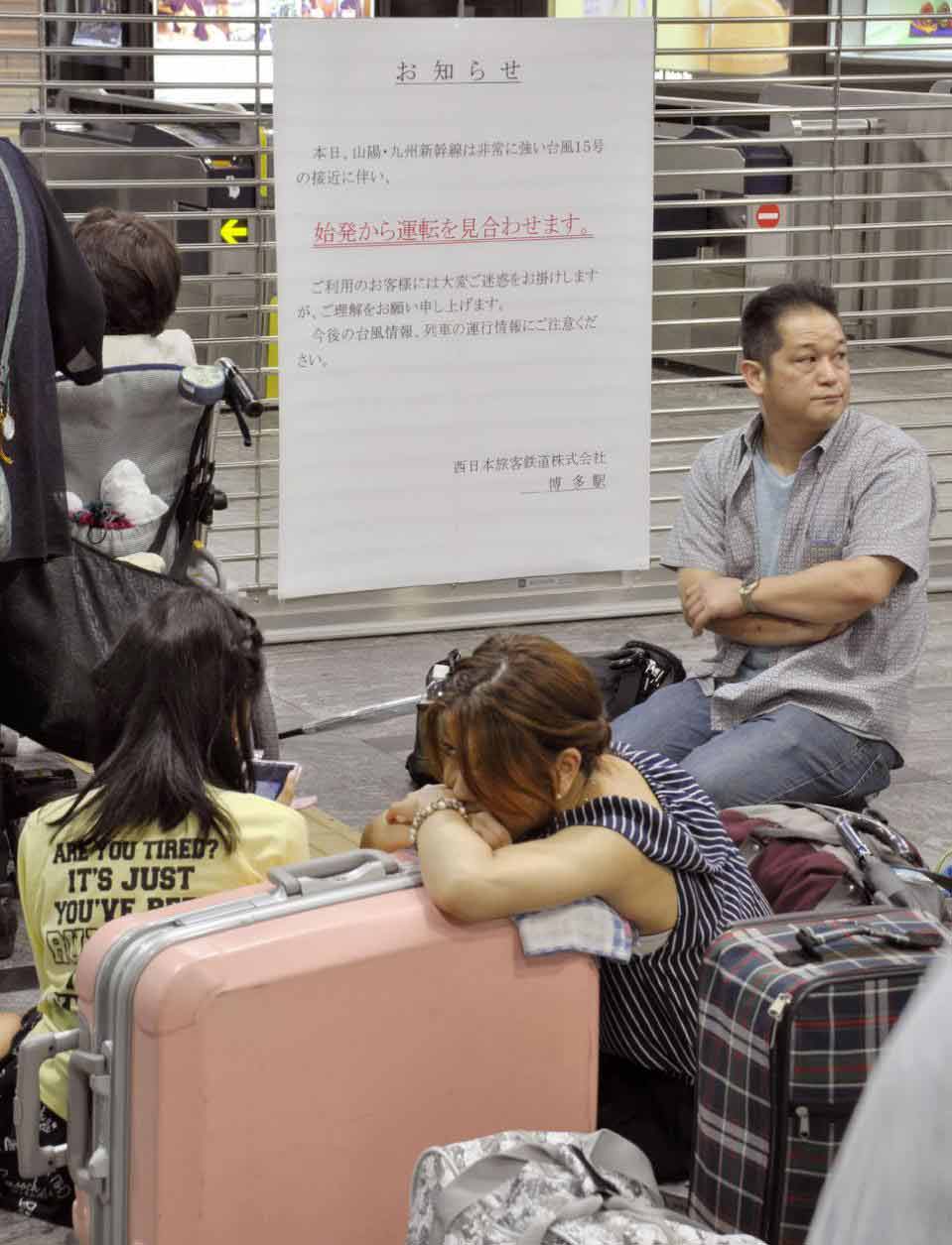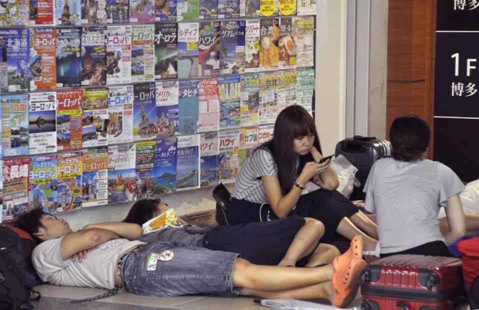 Khách hàng chờ đợi tại nhà ga Hakata sau khi bão tấn công tỉnh Kumamoto. (Ảnh: AP)
