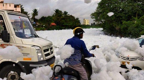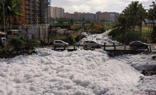 Mỗi khi gặp trời mưa, mặt hồ Bellandur ở Bangalore, Ấn Độ lại sủi bọt độc trắng xóa bay khắp thành phố tạo nên một cảnh tượng vừa đáng kinh ngạc, vừa khiến người xem gai người.