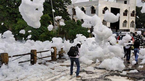 Hồ nước ngọt lớn nhất Ấn Độ gần đây có hiện tượng mặt hồ thường xuyên xuất hiện lớp bọt dày và nhẹ bay lan ra khắp nơi trong thành phố tạo nên cảnh tượng vừa kinh ngạc, vừa sởn gai ốc. Mỗi khi trời mưa xuống là mặt hồ lại xuất hiện như vậy. Đặc biệt là lớp bọt này gặp lửa là bắt cháy rất nhanh.
