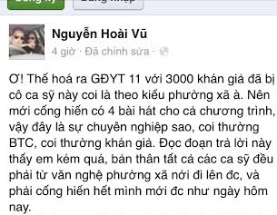 "Ơ thế hoá ra GĐYT (tên của chương tŕnh là Giai Điệu Yêu Thương) 11, với hơn 3000 khán giả đă bị cô ca sỹ này coi là theo kiểu phường xă à? nên mới cống hiến 4 bài hát cho cả chương tŕnh.