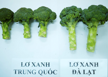 Súp lơ xanh:súp lơ Đà Lạt có lá và cây thân đầy đủ, phần bông không đều, vị ngọt đậm. Trong khi đó súp lơ Trung Quốc bị cắt mất phần thân bọc trong bao xốp, màu trắng, bông cuốn chặt, đều, để cả tháng tươi không bị hỏng, vị nhạt.
