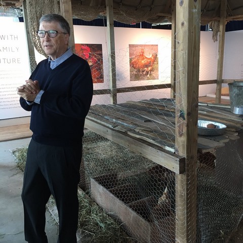Gates đứng thuyết trình trước một chuồng gà lớn và cho biết sẽ hợp tác với tổ chức Heifer để tiêm phòng cho gà. Ông mong muốn số gà được tiêm sẽ ở tăng từ mức dưới 5% lên trên 30%.