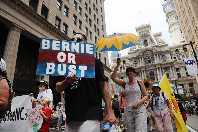 Đại hội toàn quốc Đảng Dân chủ đang diễn ra tại Philadelphia trong bầu không khí căng thẳng vì chia rẽ vì bê bối rò rỉ email. Ngay bên ngoài Hội nghị đã nổ ra cuộc biểu tình ủng hộ Thượng nghị sỹ Bernie Sander. Đoàn biểu tình hô vang khẩu hiệu “Bà Hillary phải ra đi” và “Chúng ta chiếm 99%”.
