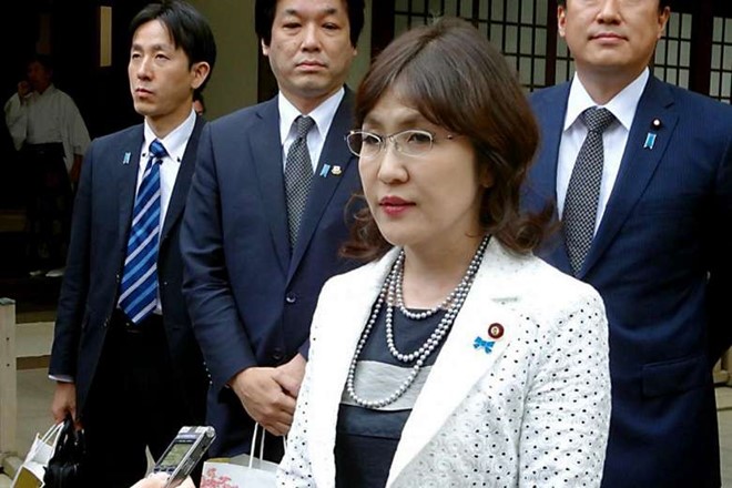 Bà Inada trả lời báo chí khi đến thăm đền Yasukuni hồi năm 2015. Đây là nơi mà Trung Quốc và Hàn Quốc coi như một biểu tượng của chủ nghĩa quân phiệt của Nhật Bản trong quá khứ. Bà Inada cùng chung quan điểm cứng rắn và diều hâu giống Thủ tướng Abe về cải cách thời hậu chiến và hiến pháp hòa bình. Ảnh: Straits Times