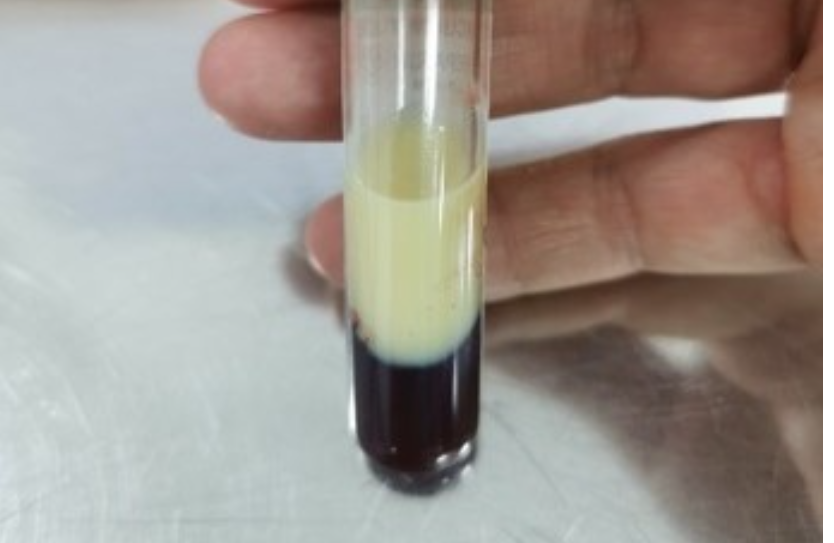 Ống máu của bệnh nhân viêm tụy cấp do tăng mỡ máu có màu trắng đục như sữa. Ảnh: BVCC.
