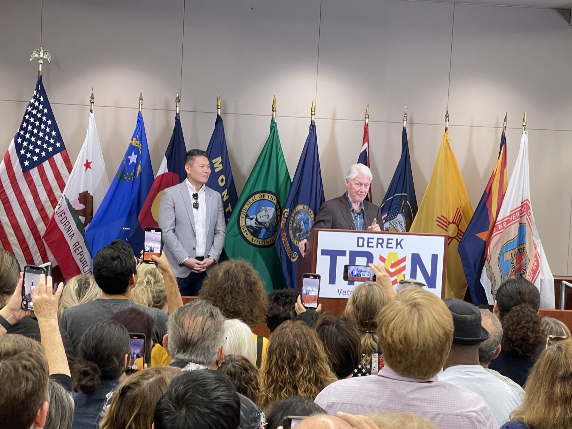 Cựu Tổng thống Bill Clinton (phải) và Luật sư Derek Trần trong cuộc vận động ở Buena Park hôm 26 tháng Mười. Đây là lần đầu tiên một cựu Tổng thống đến vận động cho một ứng cử viên gốc Việt vùng Little Saigon. (Hình minh họa: Đỗ Dzũng/Người Việt)