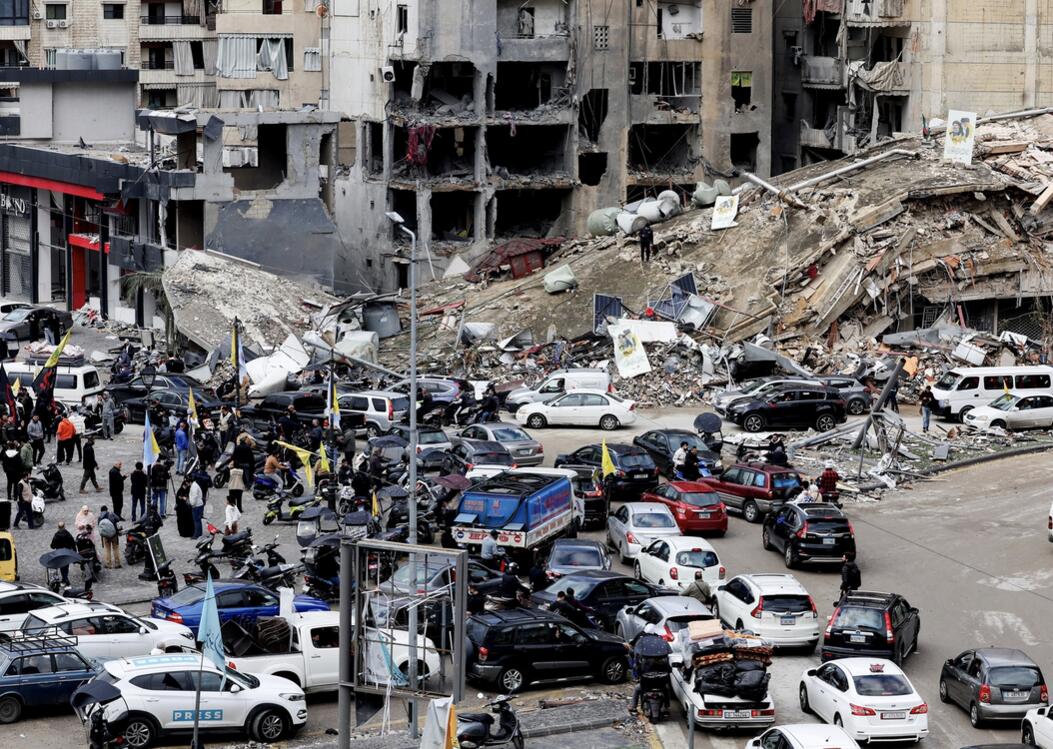 Người dân tập trung gần các tòa nhà bị hư hại ở khu vực ngoại ô phía Nam thủ đô Beirut - Lebanon hôm 27-11Ảnh: Reuters