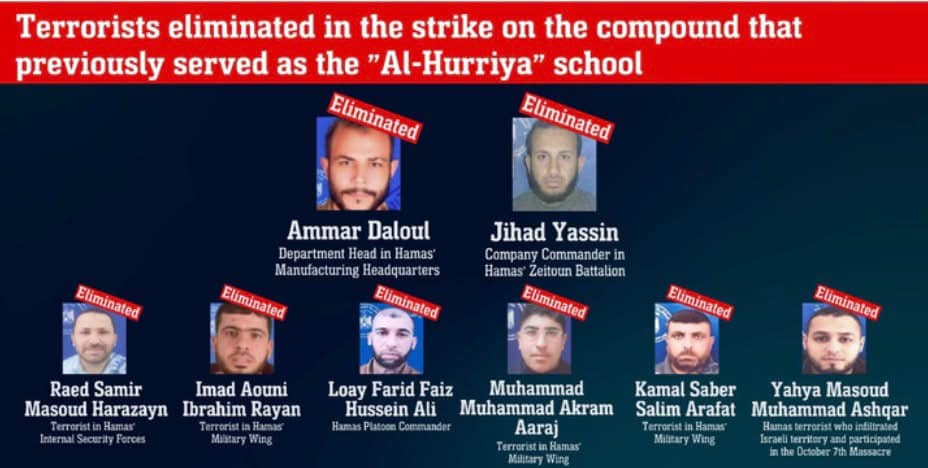 Với sự chỉ đạo của t́nh báo IDF và ISA, IAF đă tấn công chính xác và tiêu diệt Ammar Daloul, Trưởng pḥng tại Trụ sở sản xuất của Hamas và Jihad Yassin, Chỉ huy đại đội tại Tiểu đoàn Zeitoun của Hamas trong tuần qua. Những tên khủng bố này đang hoạt động trong một trung tâm chỉ huy và kiểm soát trước đây từng là Trường "Al-Hurriya" ở Thành phố Gaza.
