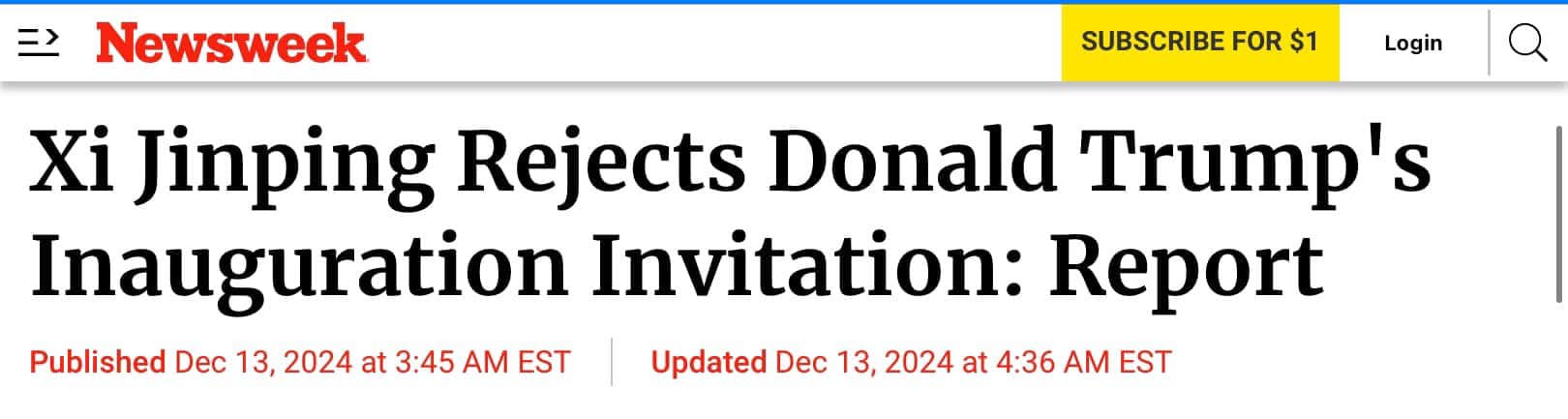 Từ hai nguồn tin đáng tin cậy với kế hoạch này cho CBS News biết : Mặc dù đă nhận được lời mời cá nhân từ Trump ngay sau ngày bầu cử, Chủ tịch Trung Quốc Tập Cận B́nh dự kiến ​​sẽ không tham dự lễ nhậm chức của Tổng thống đắc cử Donald Trump vào tháng tới,