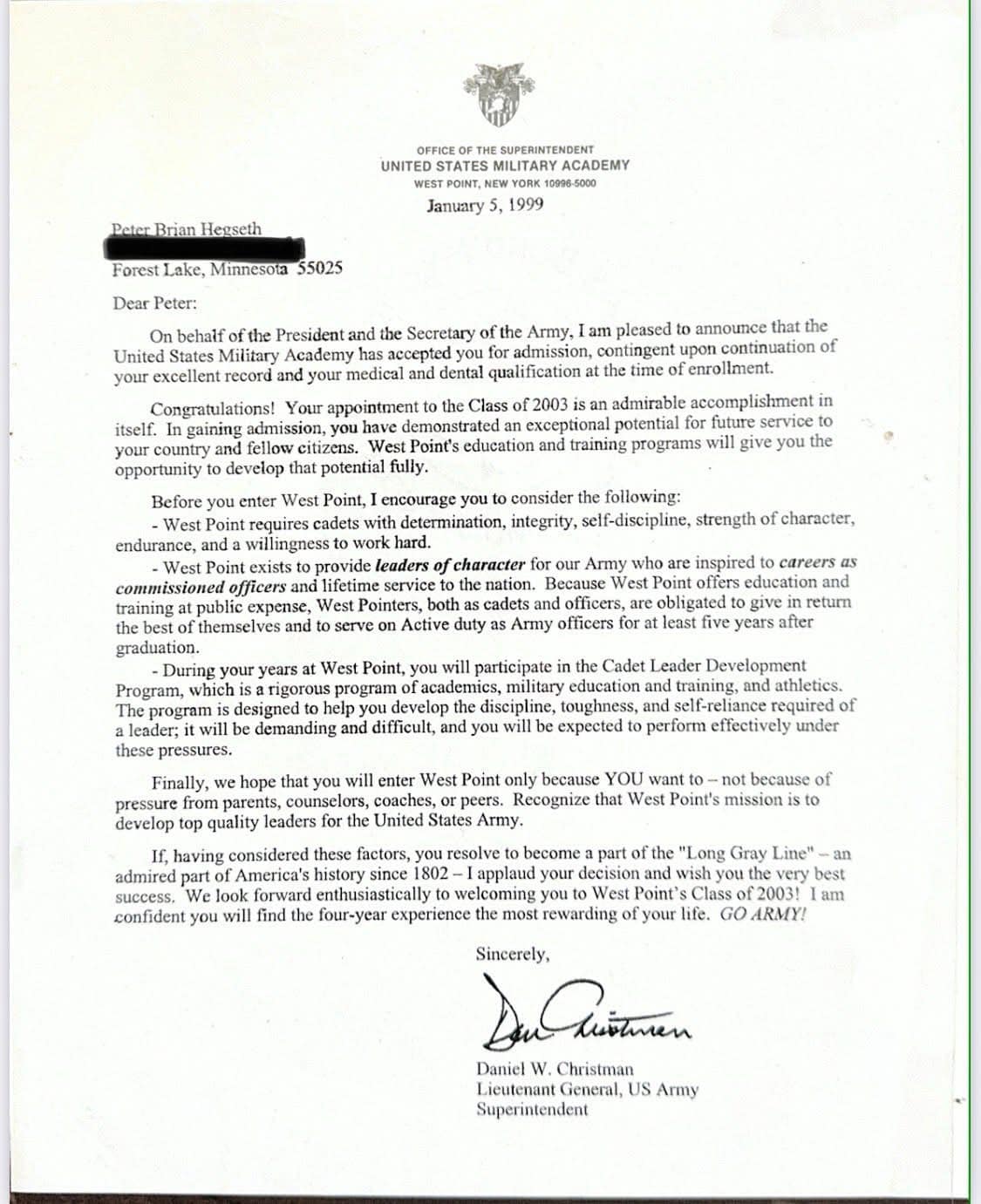 Cũng may, ông Pete Hegseth còn giữ bức thư của trường West Point nhận ông vào học, nên ông công bố bức thư này. Ông cũng cho biết cùng lúc trường West Point nhận ông vào thì một trường khác là trường Princeton University cũng nhận ông. Do đó ông không vào trường West Point.