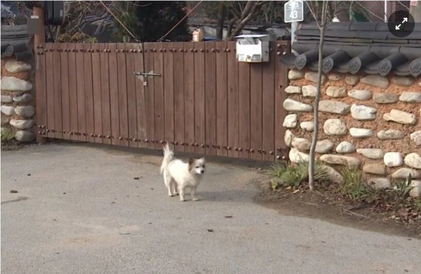 Chú chó Pudding đứng trước cửa cả ngày để chờ gia đình chủ trở về từ chuyến du lịch. Ảnh: KBS.