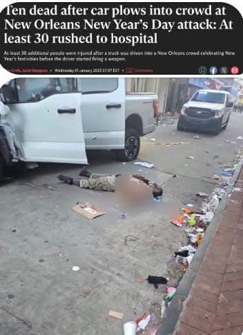 Mười người đã thiệt mạng sau khi một tài xế lái xe bán tải gắn biển số Texas đã cố tình đâm vào đám đông đang đón mừng năm mới trên đường Bourbon ở thành phố New Orleans, TB Louisiana, đã khiến ít nhất 10 người đã thiệt mạng hờ 30 người bị thương đã được đưa đến năm bệnh viện trên khắp thành phố.