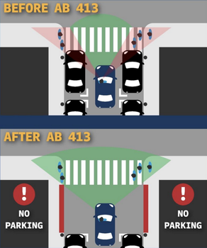 Luật Đậu Xe Ban Ngày Tại California" tuy có hiệu lực vào đầu năm 2024 và cấm đậu xe trong phạm vi 20 feet (6 m) tính từ bất cứ lằn đường đi nào dành cho người đi bộ, hoặc 15 feet (4,5 m) tính từ đường đi dành cho người đi bộ có lề đường được mở rộng, và chỉ áp dụng ở phần đường khi xe hơi chạy gần đến ngă tư.