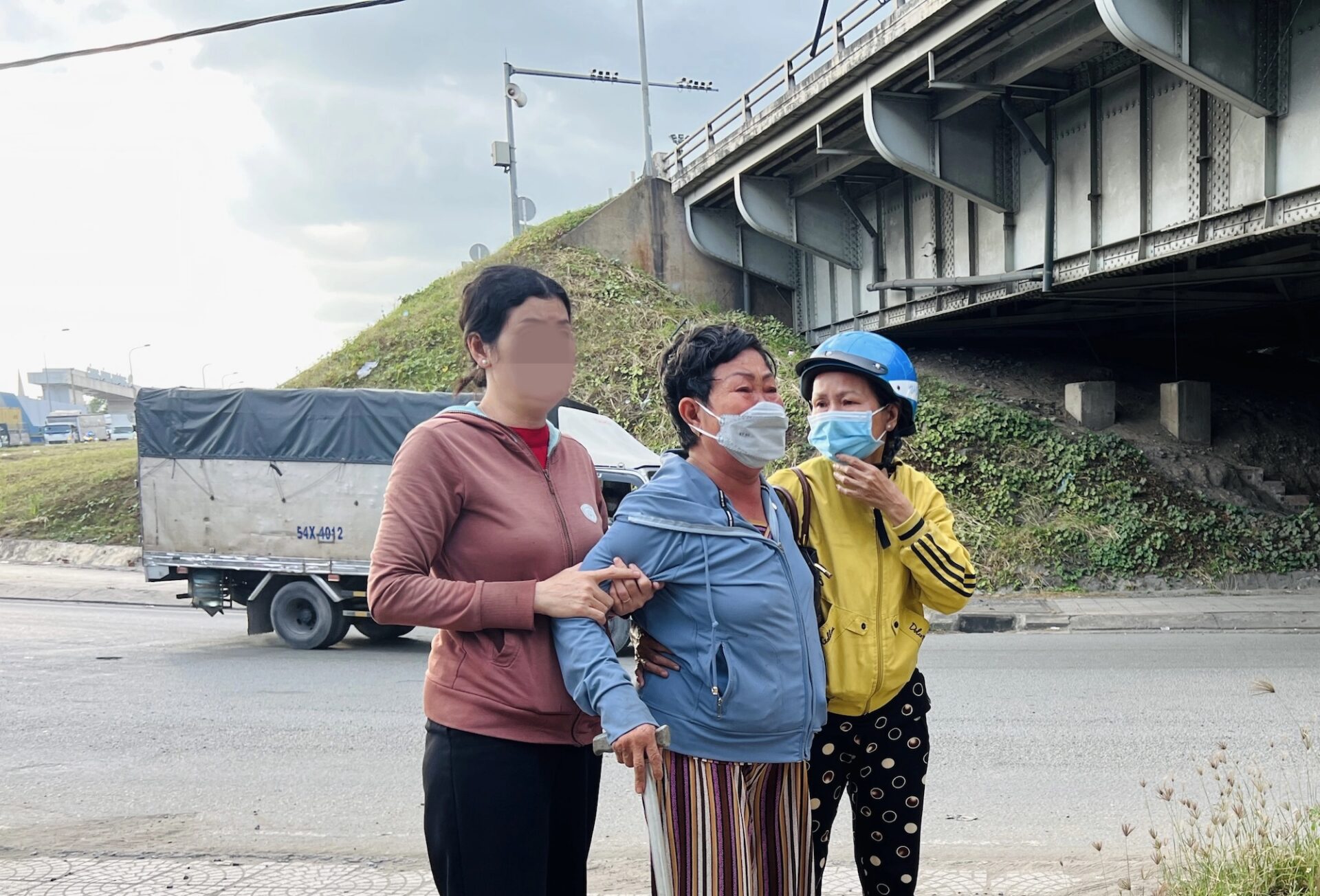 Người phụ nữ (giữa), mẹ nạn nhân, đến hiện trường để nhận dạng thi thể. (Hình: Dân Trí)