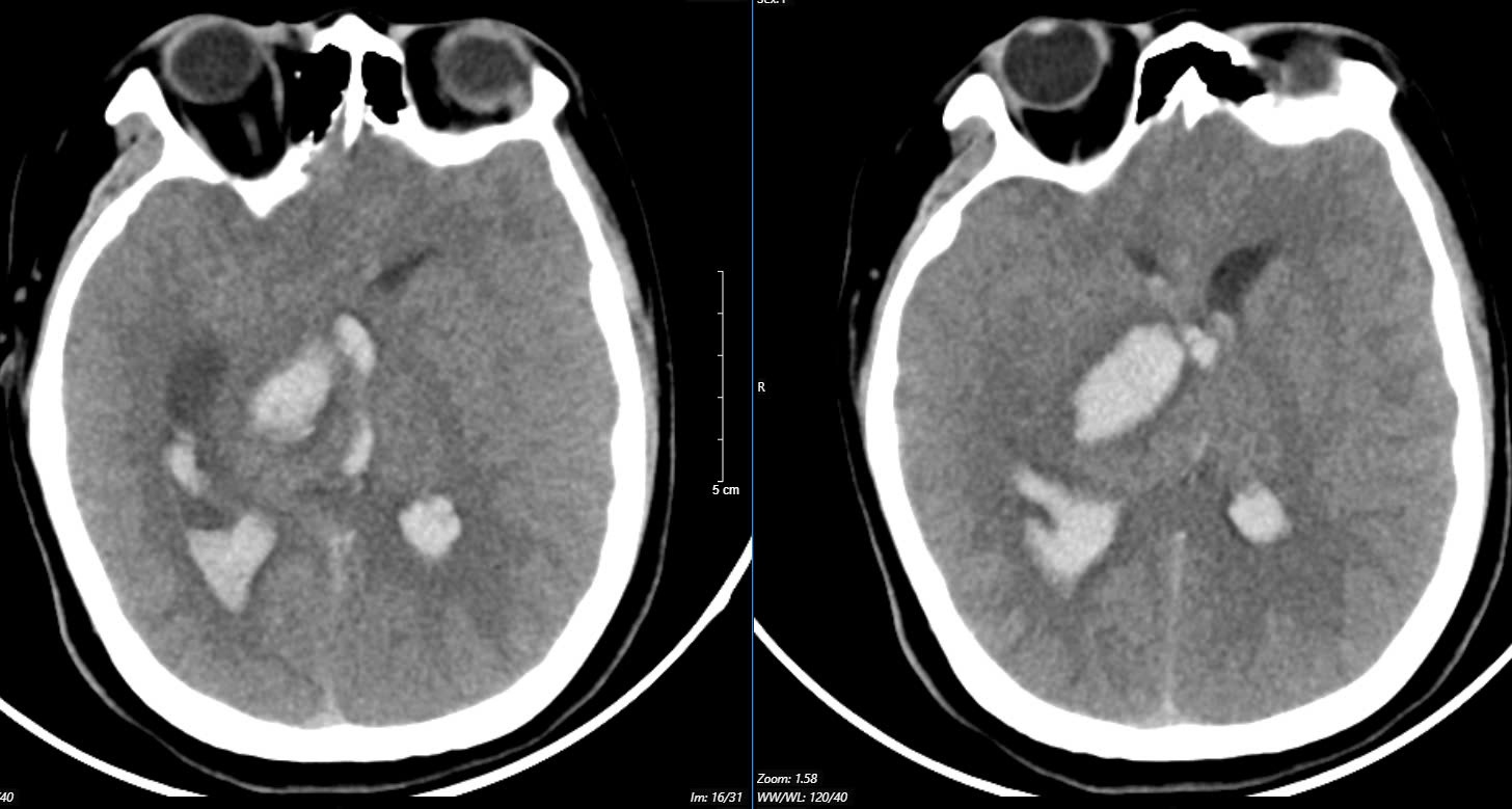 Tại Trung tâm Đột quỵ, Bệnh viện Bạch Mai, bệnh nhân ở trong tình trạng: Ý thức hôn mê sâu, Glasgow 5 điểm, thở máy, giãn đồng tử bên phải. Kết quả chụp lại phim MSCT mạch não chảy máu não đồi thị - não thất do vỡ khối AVM (dị dạng thông động- tĩnh mạch não) biến chứng giãn não thất cấp, rối loạn thân nhiệt, sốt cao liên tục 39 - 40 độ C.