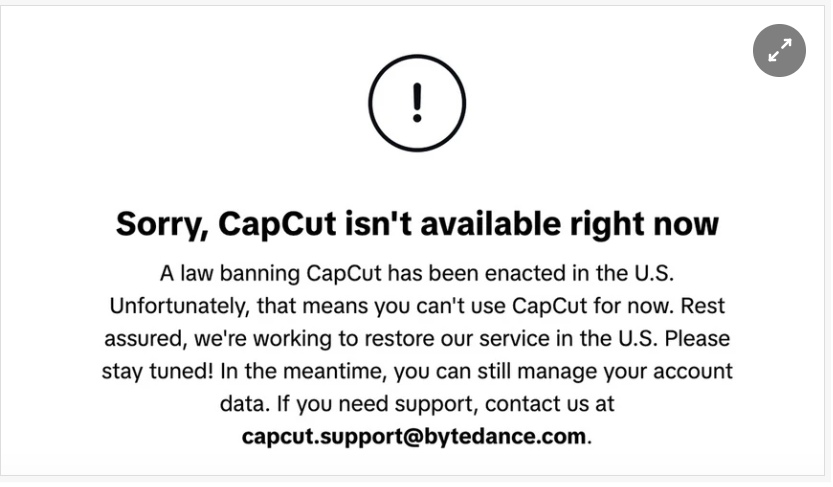 Theo The Verge, khi người dùng cố gắng truy cập Marvel Snap, CapCut hay Lemon8 sẽ nhận được thông báo tương tự với những gì TikTok hiển thị khi bị ngừng hoạt động vào 19/1. "Một luật mới đã được ban hành tại Mỹ cấm CapCut. Điều này đồng nghĩa với việc bạn không thể sử dụng CapCut vào thời điểm này. Hãy yên tâm rằng chúng tôi đang làm việc để khôi phục dịch vụ tại Mỹ. Hãy chờ đợi thêm thông tin!”, trích thông báo.