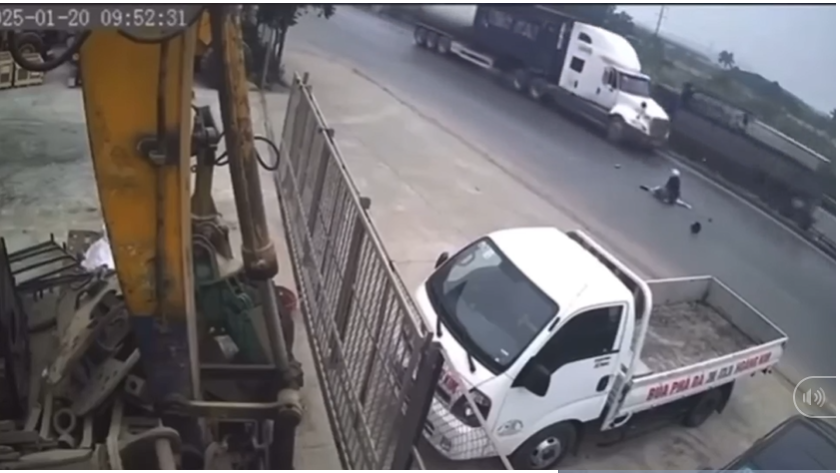 Trong khi đang lưu thông trên đường, xe máy bất ngờ mất lái, lao sang bên phải và đâm trúng xe đầu kéo chạy cùng chiều. Va chạm mạnh khiến 2 người trên xe máy ngã xuống mặt đường, trong đó một nạn nhân bị bánh xe đầu kéo cán qua, nằm bất động.