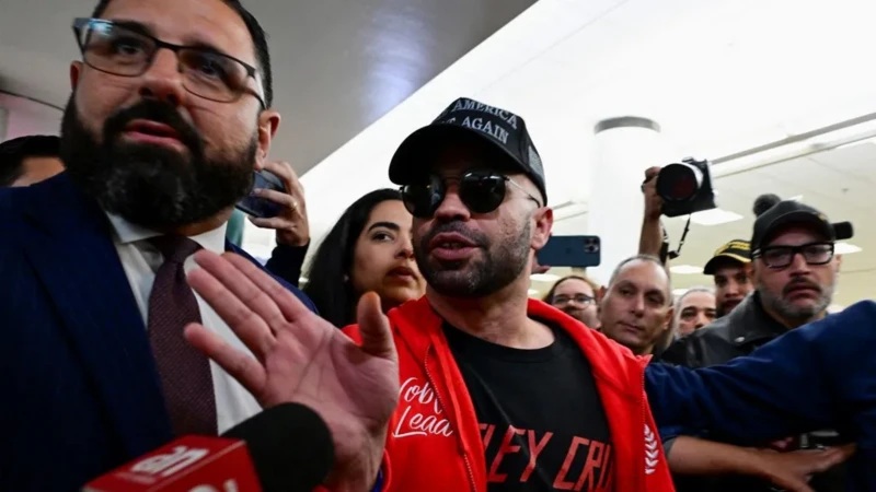 Enrique Tarrio (giữa) trả lời các phóng viên ở Miami sau khi được thả khỏi nhà tù