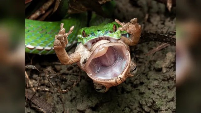 Một bức ảnh ấn tượng ghi lại khoảnh khắc một con rắn lục đang nuốt chửng một con ếch nâu trong một khu rừng nhiệt đới. Bức ảnh ghê rợn này đã lọt vào vòng chung khảo cuộc thi "Nhiếp ảnh gia cận cảnh năm 2024".