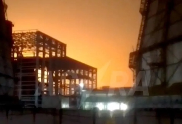 Ảnh chụp được cho là một nhà máy lọc dầu Nga bốc cháy sau một cuộc tấn công bằng máy bay không người lái của Ukraine. Ảnh: Telegram