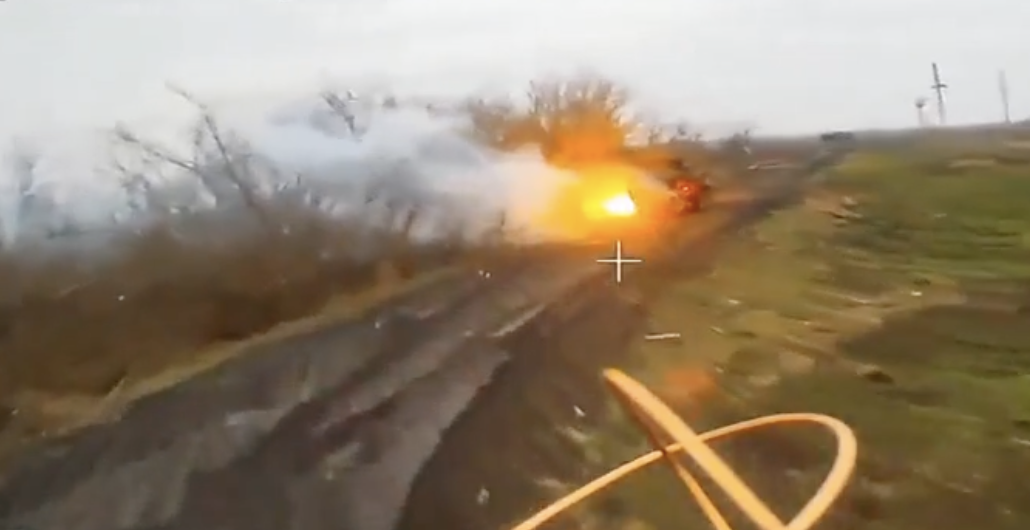 Clip cho thấy, UAV Nga đã đánh vào một xe thiết giáp Ukraine đang khựng lại trên một con đường đất, có lẽ do trúng phải hỏa lực trước đó của Nga. Cửa hậu của xe đang mở. Trong những giây cuối, có thể nhìn thấy ít nhất 5 người lính Ukraine bên trong và bên ngoài khoang phía sau của xe Stryker.