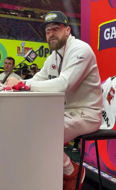 Travis Kelce tỏ ra e thẹn, ngại ngùng khi được phóng viên đặt câu hỏi về việc cầu hôn bạn gái.