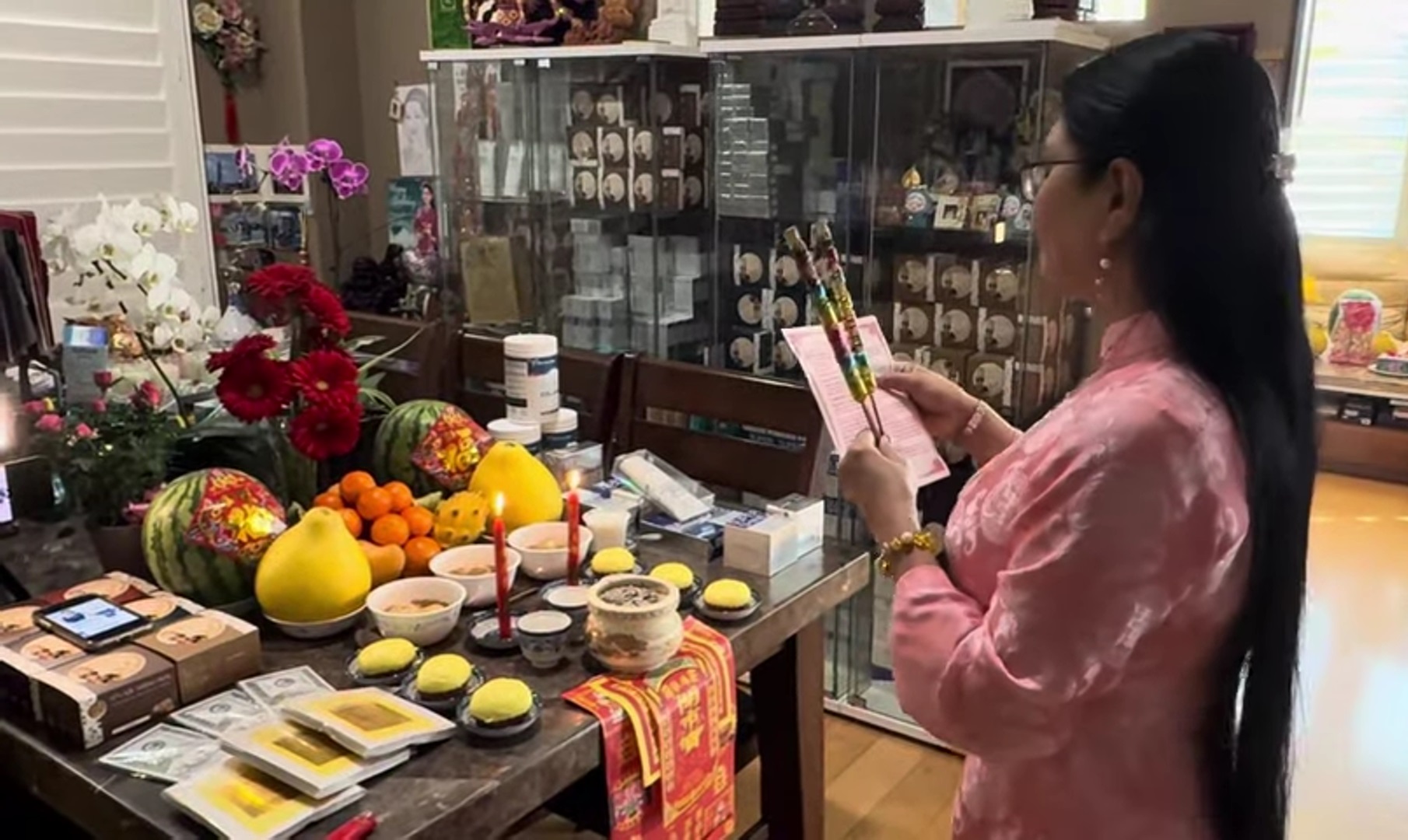Nữ nghệ sĩ chọn ngày mùng 4 để khai trương cửa hàng và bày biện lễ cúng rất đầy đủ, công phu, với đủ loại trái cây đậm chất Việt Nam như bưởi, dưa hấu và xôi chè, bánh trôi.