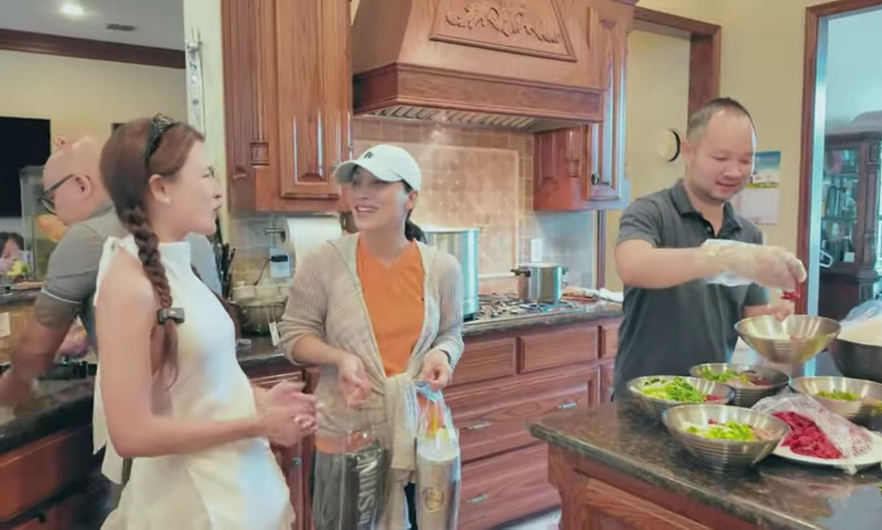 Thấy vợ chồng Hồng Ngọc nấu phở, Hà Nhi tỏ ra thích thú: “Chuẩn bị ăn phở thôi. Chủ yếu tôi qua đây để ăn phở còn tặng quà là phụ. Phở anh Tâm nấu rất ngon. Tôi còn dẫn hẳn hai vị khách từ Việt Nam qua để ăn phở anh Tâm, anh nên mở quán phở đi thôi.