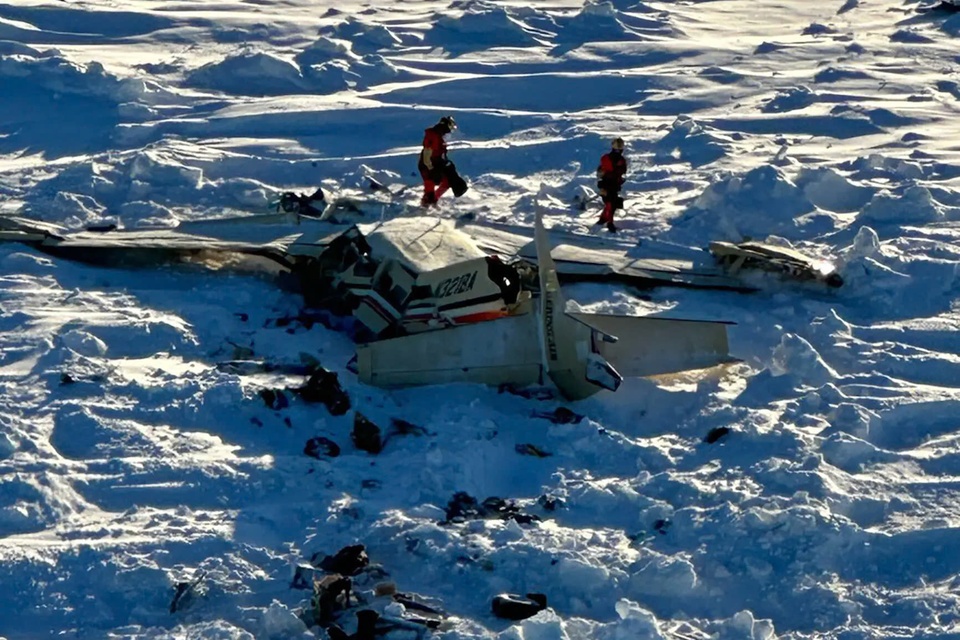 Một bức ảnh do Lực lượng Bảo vệ bờ biển Mỹ cung cấp cho thấy xác máy bay vỡ vụn và các mảnh vỡ nằm trên nền băng biển. Hai người mặc đồ bảo hộ khẩn cấp màu sáng đứng quanh đống đổ nát.
