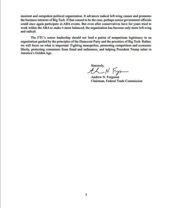Cũng liền sau khi có báo cáo Hội luật sư Mỹ nhận 121 triệu từ USAID để kiện chính phủ Mỹ cũng như giúp đở các hội đoàn luật nước khác, kiện chính phủ Mỹ. Ủy ban Thương mại Liên bang (Federal Trade Commission-FTC) vừa ra lệnh cắt đứt mọi liên lạc với hội Luật sư Hoa Kỳ (American Bar Association-ABA)—cấm các quan chức tham gia, phát biểu hoặc dùng tiền thuế của người dân để cho nhóm này.