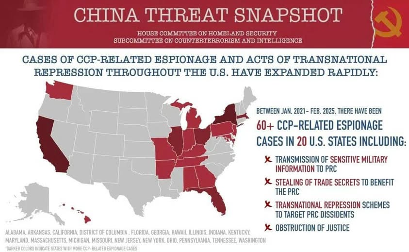 Theo báo cáo mới nhất do Ủy ban An ninh Nội địa Hạ viện Hoa Kỳ công bố, hơn 60 vụ việc gián điệp và đàn áp xuyên quốc gia liên quan đến Đảng Cộng sản Trung Quốc đã được báo cáo tại 20 tiểu bang.