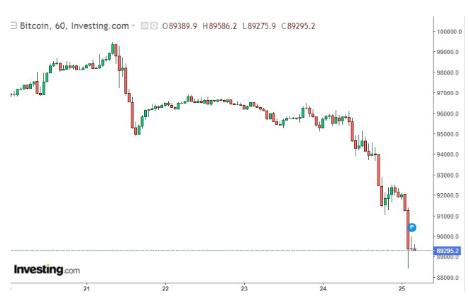 Cụ thể, Bitcoin - đồng tiền điện tử lớn nhất thế giới theo giá trị thị trường - đã giảm tới 6% xuống còn 88.245 USD, mức thấp nhất ba tháng kể từ tháng 11. Đây cũng là lần đầu tiên giá Bitcoin giảm xuống dưới 90.000 USD kể từ giữa tháng 1.
