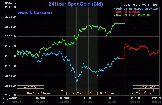 Chốt phiên giao dịch 3/3, giá vàng thế giới giao ngay tăng 36 USD lên 2.893 USD một ounce. Đồng đôla yếu và nhu cầu mua vàng trú ẩn do lo ngại thuế nhập khẩu của Mỹ đã kéo thị trường lên.
