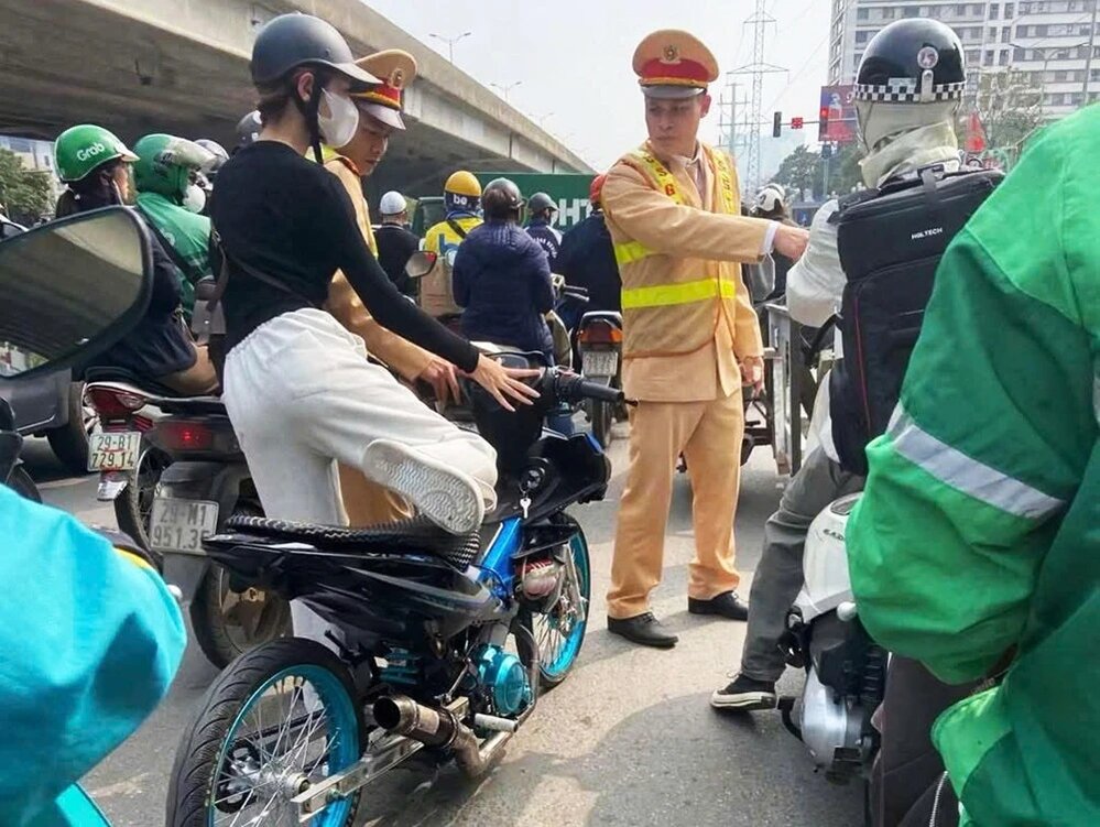 Qua kiểm tra, cảnh sát xác định người điều khiển phương tiện là cô Hoàng Thị Q.A. (17 tuổi, trú tại Hoàng Mai, Hà Nội). Phương tiện của cô Q.A. điều khiển xe máy trên 50 phân khối, không gắn biển xe kiểm soát, "độ" chiếc pô, không gắn gương chiếu hậu,...