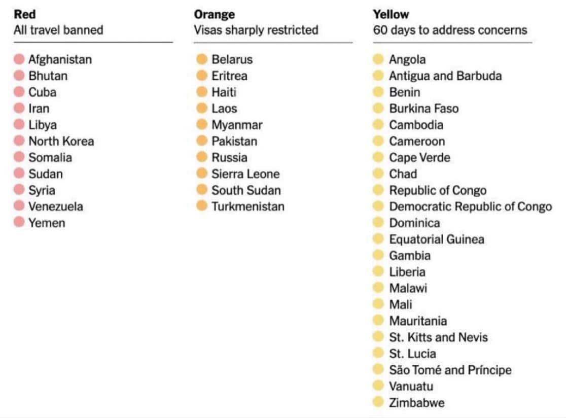 Chính quyền của tổng thống Trump đã lên danh sách 43 quốc gia mà công dân của họ hiện sẽ phải đối mặt với các yêu cầu nhập cảnh chặt chẽ hơn vào Hoa Kỳ. Hệ thống hạn chế mới có ba cấp độ: đỏ, cam và vàng.